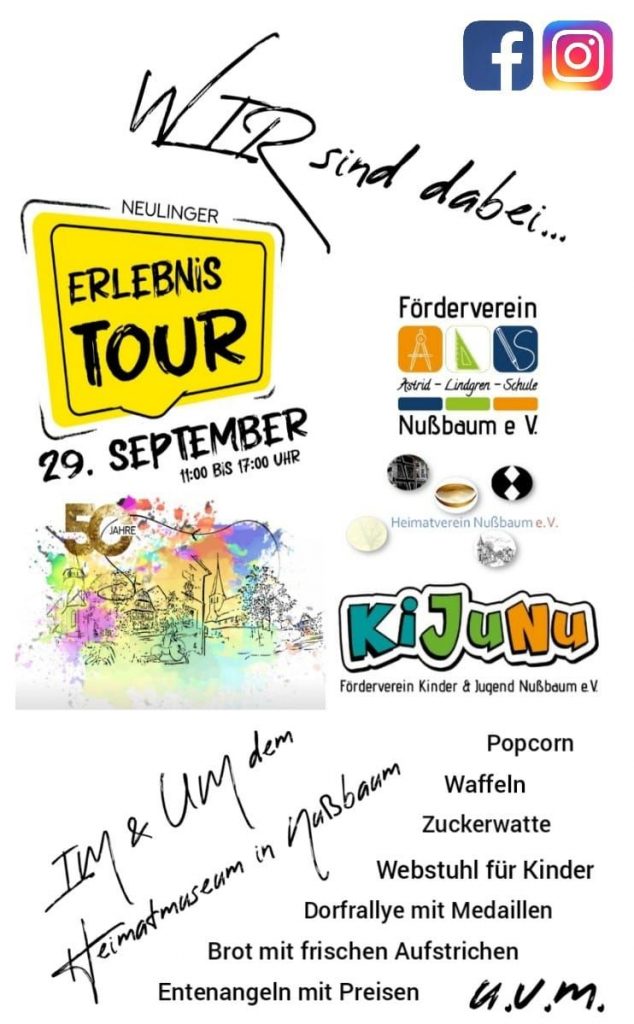 Anlässlich des Jubiläums “50 Jahre Neulingen” veranstalteten die Neulinger Vereine am 29. September eine Erlebnistour rund um alle drei Ortsteile. Auch wir vom KiJuNu waren zusammen mit dem FV ALS und dem Heimatverein dabei und stellten in Nußbaum eine bunte Spielstraße für kleine und große Kinder auf die Beine.