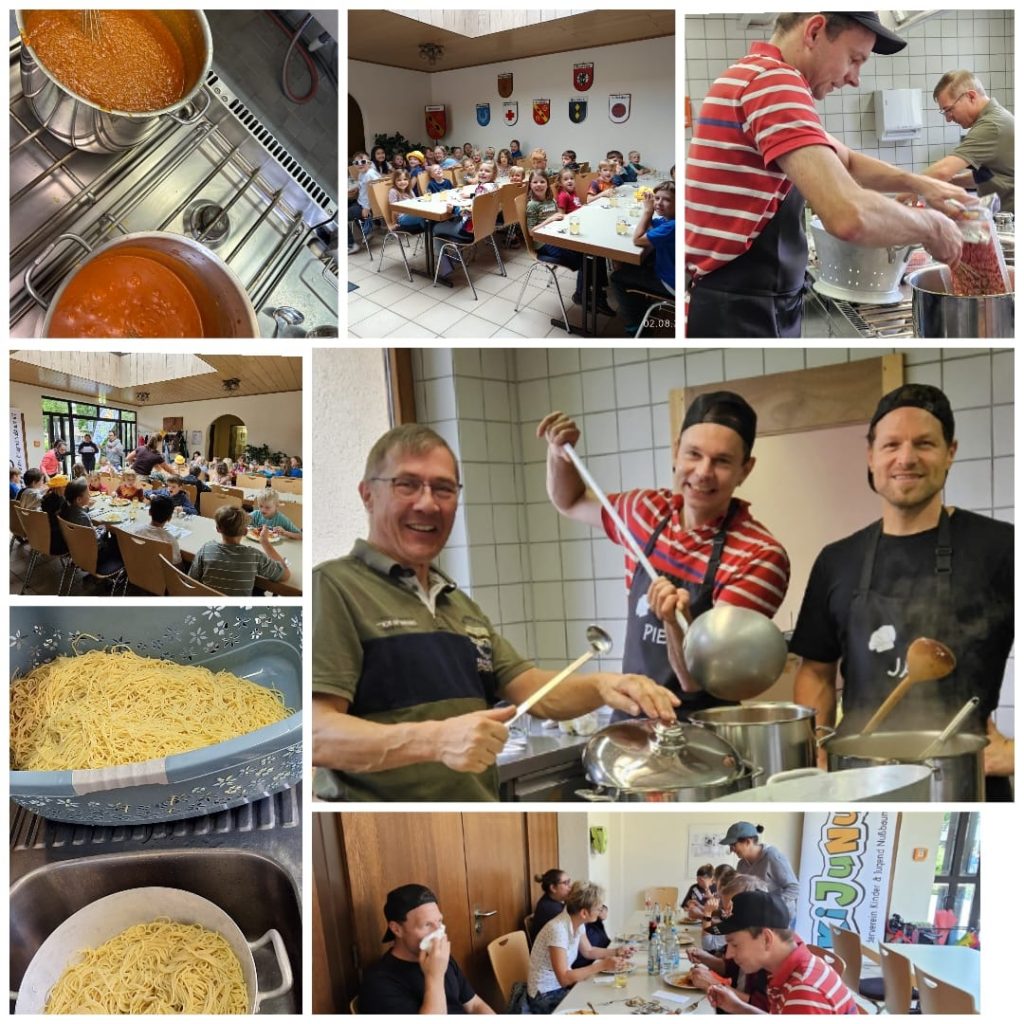 Während die Kinder draußen forschten, herrschte auch im Foyer geschäftiges Treiben: Steffi und Dani richteten alles für das gemeinsame Mittagessen her. Parallel dazu standen Peter, Jan und Thomas in der Küche, wo sie über 6 Kilogramm Spaghetti kochten – dazu gab es Bolognese und die bei allen beliebte Variante „à la Mama“.