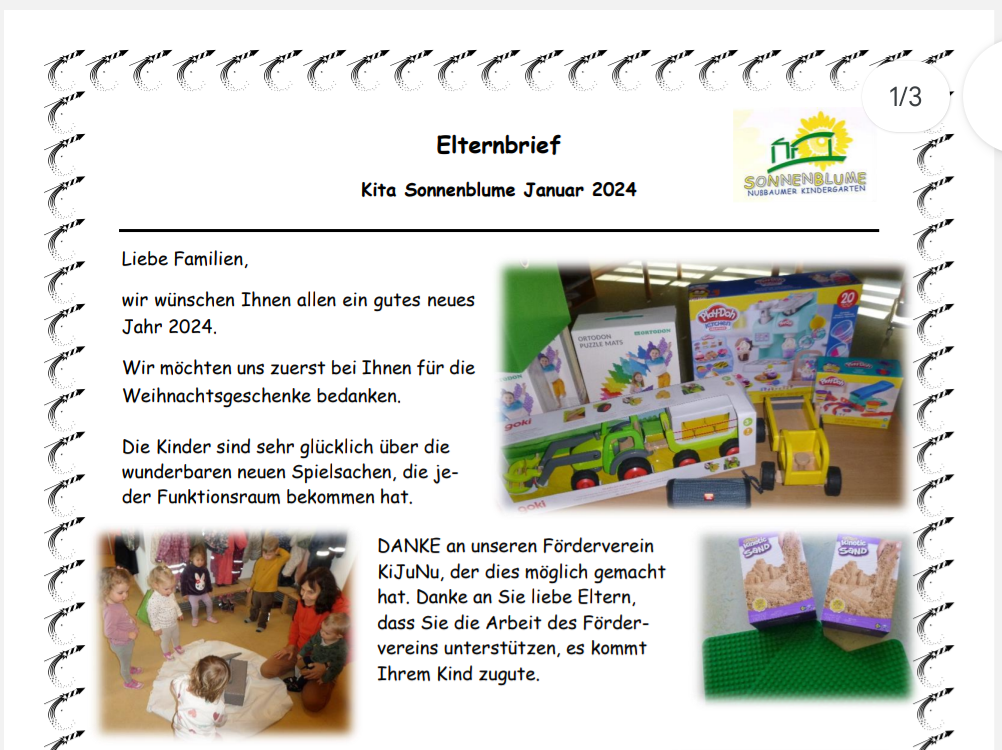 Auch 2024 konnten wir Dank eines erfolgreichen Jahres wieder jeder Kindergartengruppe ein Geschenk (Spielzeug) für ihren Gruppenraum zukommen lassen. Die Erzieherinnen und vor allem die Kinder nahmen die Sachen mit strahlenden Augen entgegen und werden sicher das ganze Jahr über viel Freude damit haben.